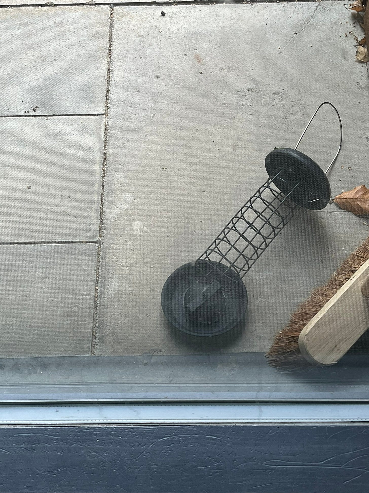 I had occasion to call on some neighbours the next day and asked if I might check their front gardens quickly in case the bird feeder had ‘been blown there by the wind’.